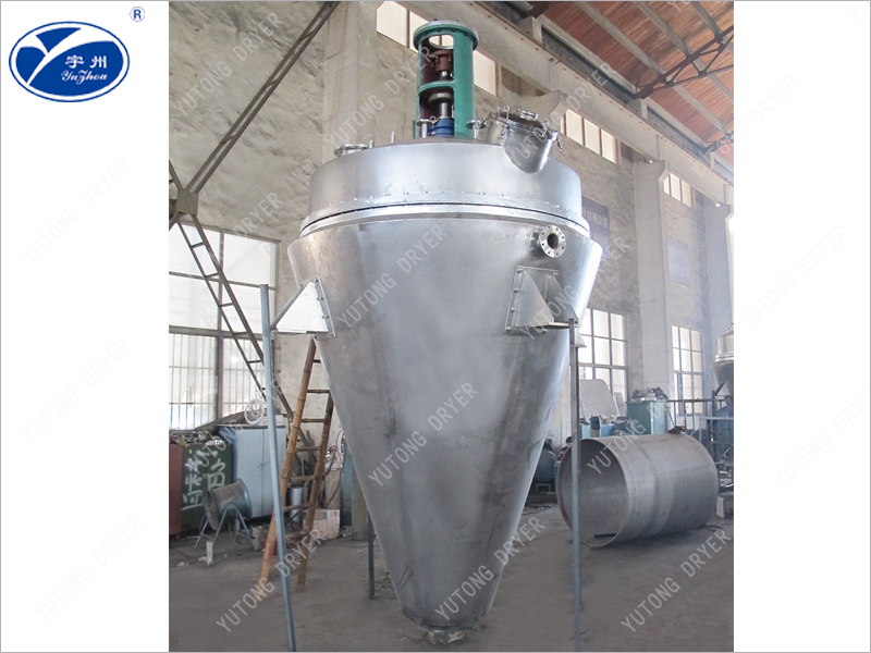 該設備主體立式靜止,內部加熱的螺帶進行圓周攪拌提升運動,物料進入干燥腔體后利用夾套和攪拌螺帶對物料接觸加熱,物料被螺帶有序的攪動,翻轉、提升、瀑落,使物料不斷的與加熱腔壁接觸而進行強制熱交換,受熱揮發(fā)的溶媒在真空狀態(tài)下被抽走,從而達到快速干燥的目的。