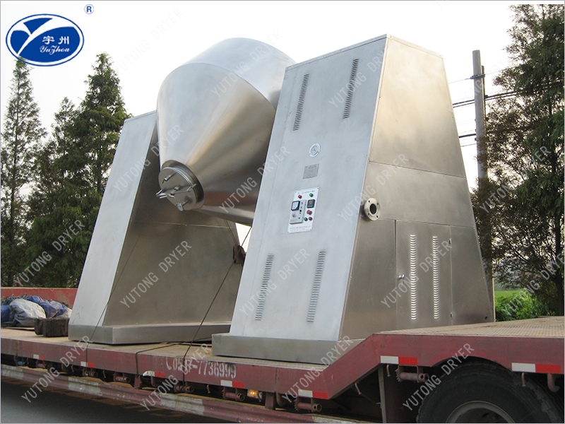 SZG系列雙錐回轉(zhuǎn)真空干燥機(jī)為雙錐形的回轉(zhuǎn)罐體,罐內(nèi)在真空狀態(tài)下,向夾套內(nèi)通入蒸汽或熱水進(jìn)行加熱,熱量通過(guò)罐體內(nèi)壁與濕物料接觸。濕物料吸熱后蒸發(fā)的水汽,通過(guò)真空泵經(jīng)真空排氣管被抽走。由于罐體內(nèi)處于真空狀態(tài),且罐體的回轉(zhuǎn)使物料不斷的上下,內(nèi)外翻動(dòng),故加快了物料的干燥速度,提高干燥效率,達(dá)到均勻干燥的目的。