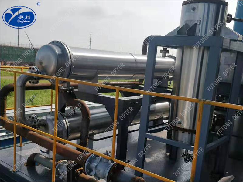 物料從加熱區(qū)的上方徑向進(jìn)入蒸發(fā)器,經(jīng)布料器分布到蒸發(fā)器加熱壁面,然后旋轉(zhuǎn)的刮膜器將物料連續(xù)均勻地加熱面上刮成厚薄均勻的液膜,并以螺旋狀向下推進(jìn)。在此過程中,旋轉(zhuǎn)的刮膜器保證連續(xù)和均勻的液膜產(chǎn)生高速湍流,并阻止液膜在加熱面結(jié)焦、結(jié)垢,從而提高傳總系數(shù)。輕組份被蒸發(fā)形成蒸汽流上升,經(jīng)汽液分離器到達(dá)和蒸發(fā)器直接相連的外置冷凝器,重組份從蒸發(fā)器底部的錐體排出。 一個(gè)獨(dú)特的布料器不僅僅具有將物料均勻地流向蒸發(fā)器內(nèi)壁,防止物料濺到蒸發(fā)器內(nèi)部噴入蒸汽流,還具有防止剛進(jìn)入的物料在此處閃蒸,有利于泡沫的消除,物料只能沿著加熱面蒸發(fā)。在刮膜蒸發(fā)器的上部配有一個(gè)依據(jù)物料特性設(shè)計(jì)的離心式分離器,將上升蒸汽流中的液滴分離出來并返回布料器。