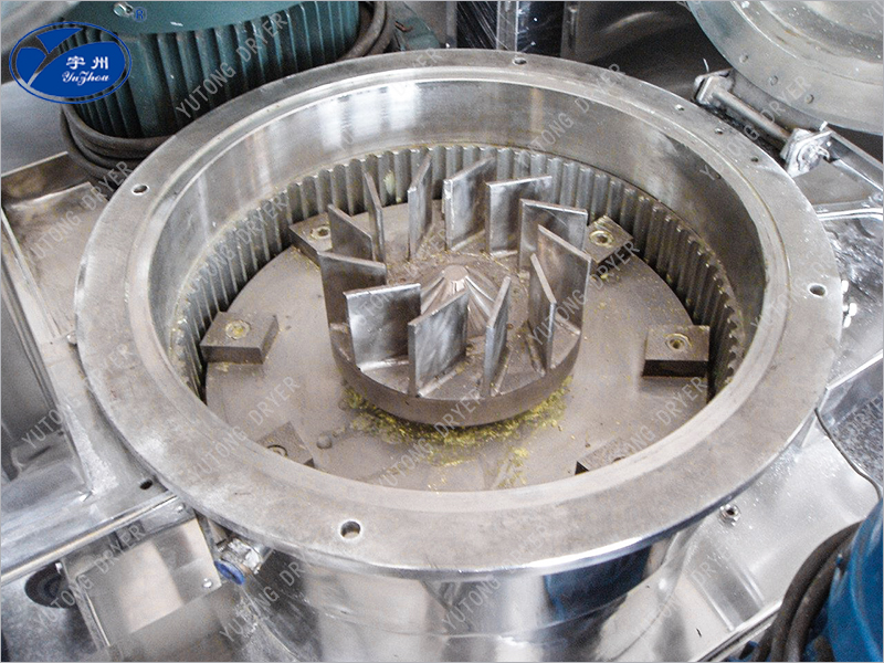 物料由料斗經(jīng)螺旋輸送器進入粉碎室,粉碎物經(jīng)高速刀片剪切獲得粉碎,通過負壓風運的方法把物料運入旋風分離器,袋式除塵器、排出物料達到產(chǎn)品的要求。