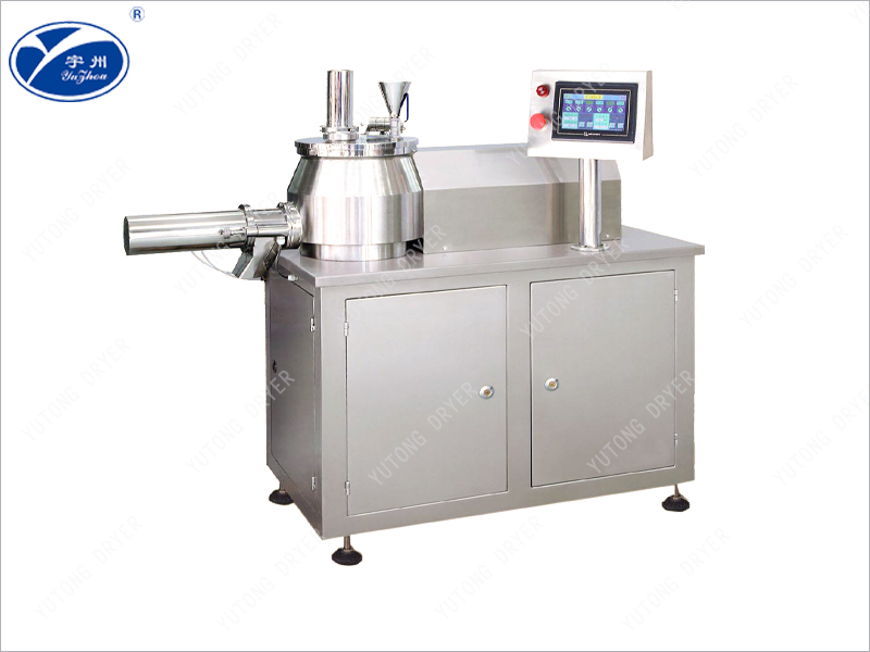 粉體物料與粘合劑在圓筒形容器中由底部混合漿充分混合成濕潤(rùn)軟材,然后由側(cè)置的高速粉碎槳切割成均勻的濕顆粒。